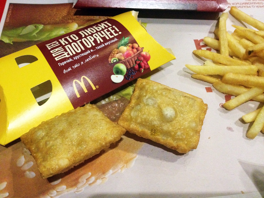 Во второй половине дня нужно было ехать в Лавку иллюстраторов на Новый Арбат, чтобы забрать свои работы и получить гонорар за то, что было продано. Чтобы вы понимали масштабы коммерческих перспектив в мире современного искусства, за эти две недели я заработала 315 рублей, которые мне незамедлительно выплатили. Мы с О. (а я была с О.), не долго думая, тут же прокутили их в Макдональдсе. Что называется, гульнули по полной, ни в чём себе не отказывая. Но рассказать я хотела не об этом. А о том, что пока мы с вами рассуждаем об искусстве, в реальной жизни случилась настоящая революция. Теперь в Макдональдсе пирожок — это не просто пирожок, как раньше, а два маленьких пирожка!!! Мир уже не будет прежним.