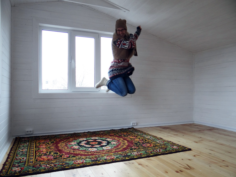 Хотя помимо котиков была ещё одна цель — первый раз поработать в новенькой мастерской с двумя окнами, о которой я мечтала всю зиму! И вот теперь, когда потеплело, наконец-то можно было приступить! Правда, сюрпризом стал ковёр на полу — это старый семейный раритет, который бабушка с дедушкой сплели сами, вручную, по дедушкиному эскизу. Раньше он висел на стене, а здесь неожиданно хорошо вписался в мой white cube, поэтому я даже решила пока оставить так.