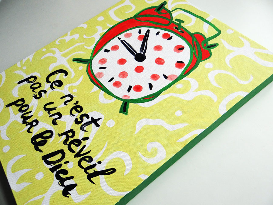 Гугл-транслейтеру в таких важных вопросах доверить я не могла, поэтому перевести на французский нужную мне фразу «Это не будильник для Бога» я попросила К. — она самый продвинутый пользователь иностранных языков из всех, кого я знаю. Теперь следующий художник пишет концепцию, имея на руках только изображение моей работы. Очень любопытно посмотреть на все остальные звенья, особенно на самое первое. Я, правда, догадываюсь, что там было, но наверняка не знаю. Я в этой цепи восьмая. И за мной ещё толпа. Всё раскроется в воскресенье, на очередной лекции Андрея Григорьевича в Гараже. Сама я, к сожалению, не смогу прийти, но надеюсь, что С. пришлёт мне свою презентацию и покажет проект полностью.