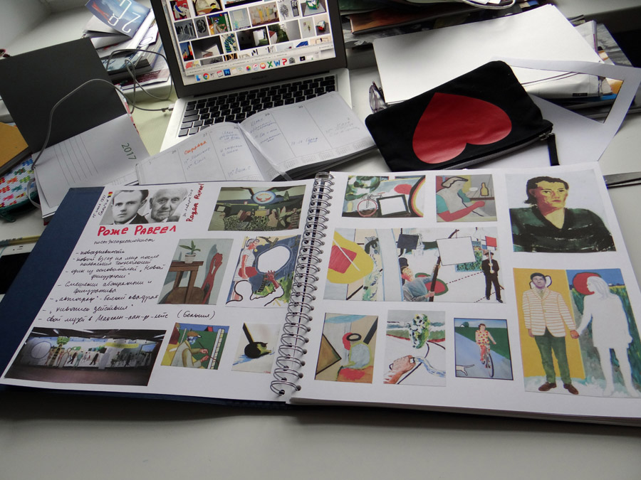 Поэтому я осталась дома и сделала альгинатную маску для лица, а потом начала альбом про художников, которые мне нравятся. Первый разворот посвятила Роже Равеелю, он классный.