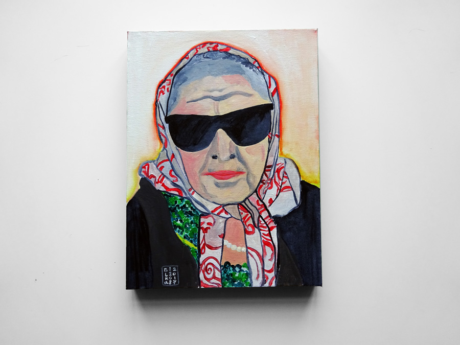 А ещё сегодня я написала портрет бабушки в её любимых солнечных очках, без которых она летом из дома почти не выходит. У неё скоро день рождения, и это мой подарок. Папа едет в деревню, как раз передаст. Надеюсь, ей понравится. Сдерживала себя и рисовала на пределе своих реалистических возможностей, хотя соблазн подрисовать всякого сюра был велик, как всегда 🙂