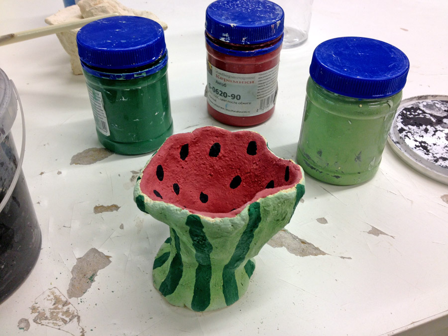 Ну и раскрасила всё, что меня ожидало после первого обжига, а это мороженица-арбуз и шкатулка в форме тортика.